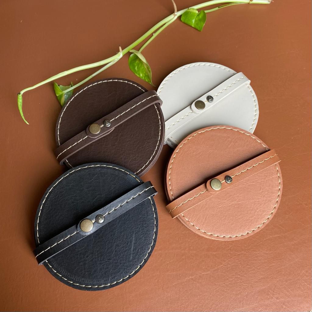 Kit com quatro porta copos em material sintético e acabamento em pesponto.